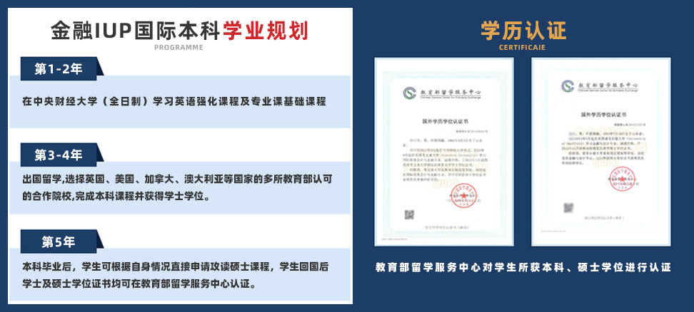 为满足更多学生在国内就能够分享国外优质教育资源的求学需求,减少学生昂贵的留学费用,留学服务中心与中央财经大学共同成立国际本科项目(International Undergraduate Programme,即IUP)。依托中央财经大学的优质教育资源,项目采用全英文教学模式,学生在中央财经大学学习两年,出国后可免修在国内已经修过的学分,从而缩短在国外的学习时间,并大大降低留学成本。国内课程设置以英语强化和国外大学专业课程为主,课程教学方法、学生考核标准、教材等均达到与国外合作大学专业衔接的标准。